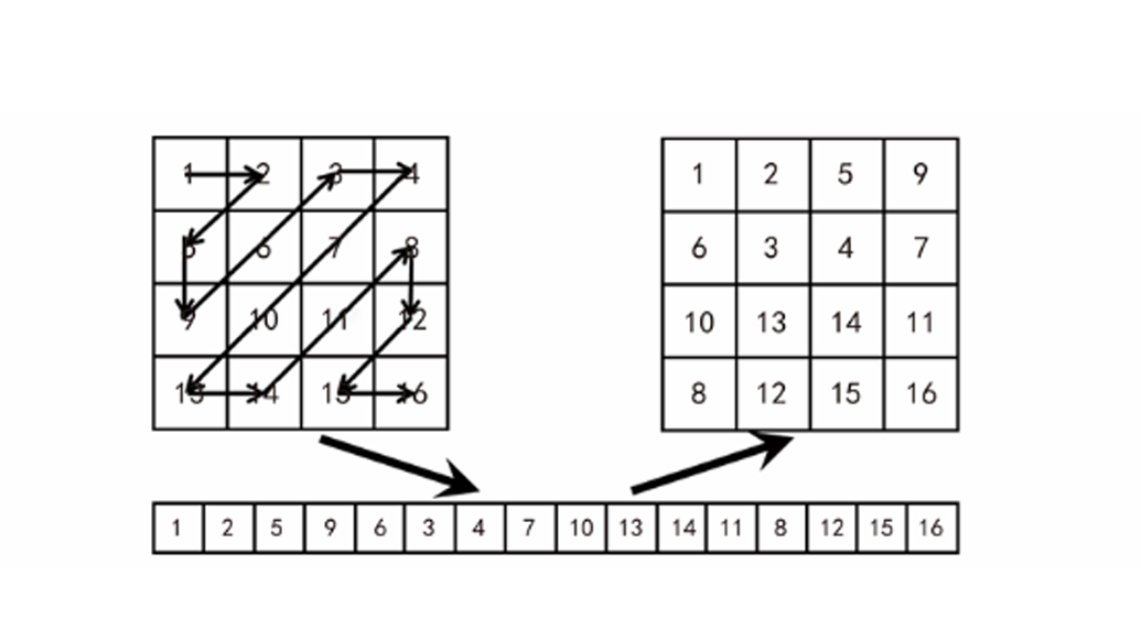 # 1. 扫描 zigzag_1d = zigzag_scan(test_mat) print(f"\nZigzag 扫描结果 (1D): {zigzag_1d}") # 预期结果: [1, 2, 3, 4, 5, 6, 7, 8, 9, 10, 11, 12, 13, 14, 15, 16] # (如果是上面的矩阵数值设计,刚好的顺序应该是递增的,这验证了路径正确性)