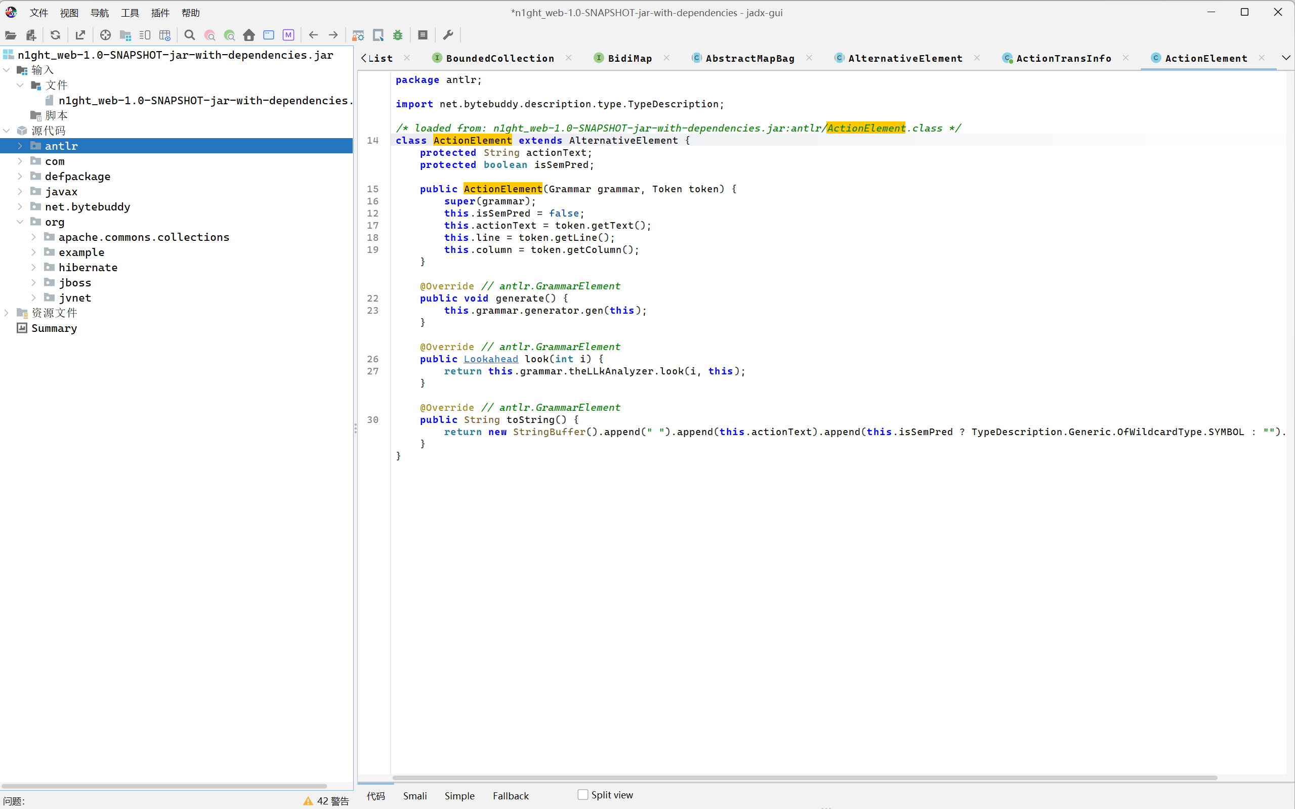 好吧,其实是不可能一个一个贴出来的,这边运用的程序叫jadx,因为题目给我们的是jar文件,我们直接看是看不懂的,那是给计算机看的,我们需要将jar里面的内容反编译成我们能看的内容,这个程序就是反编译java用的,re的装备。