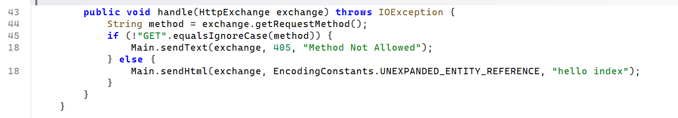 /example/Main$IndexHandler.class */ static class IndexHandler implements HttpHandler { IndexHandler() { } public void handle(HttpExchange exchange) throws IOException { String method = exchange.getRequestMethod(); if (!”GET”.equalsIgnoreCase(method)) { Main.sendText(exchange, 405, “Method Not Allowed”); } else { Main.sendHtml(exchange, EncodingConstants.UNEXPANDED_ENTITY_REFERENCE, “hello index”); } }
