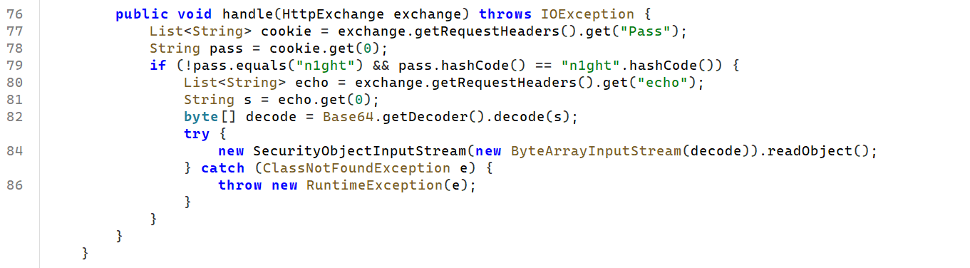 cookie = exchange.getRequestHeaders().get(“Pass”); String pass = cookie.get(0); if (!pass.equals(“n1ght”) && pass.hashCode() == “n1ght”.hashCode()) { List echo = exchange.getRequestHeaders().get(“echo”); String s = echo.get(0); byte[] decode = Base64.getDecoder().decode(s); try { new SecurityObjectInputStream(new ByteArrayInputStream(decode)).readObject(); } catch (ClassNotFoundException e) { throw new RuntimeException(e); } } } }