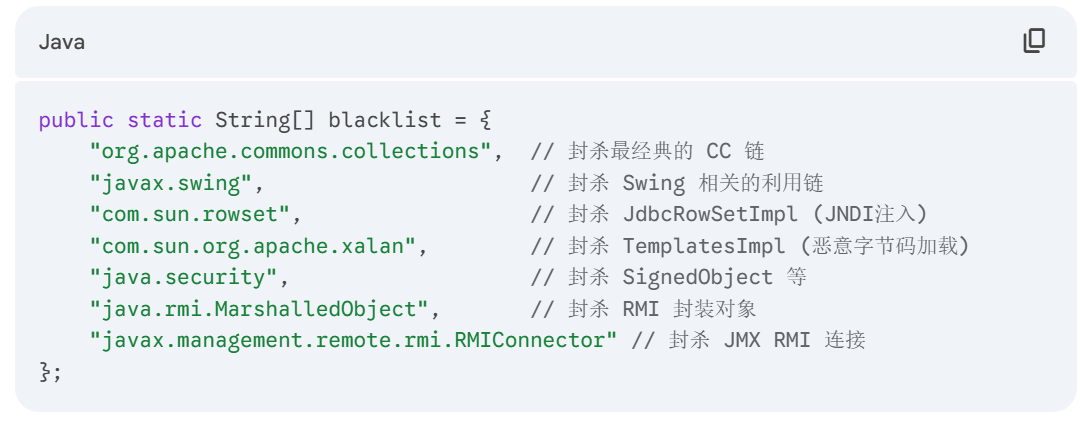 public static boolean contains(String targetValue) { for (String forbiddenPackage : blacklist) { if (targetValue.contains(forbiddenPackage)) { return true; } } return false; }}这段代码设置了一个黑名单,禁用{“org.apache.commons.collections”, “javax.swing”, “com.sun.rowset”, “com.sun.org.apache.xalan”, “java.security”, “java.rmi.MarshalledObject”, “javax.management.remote.rmi.RMIConnector”}这些东西。其实我也看不懂这些东西是什么。