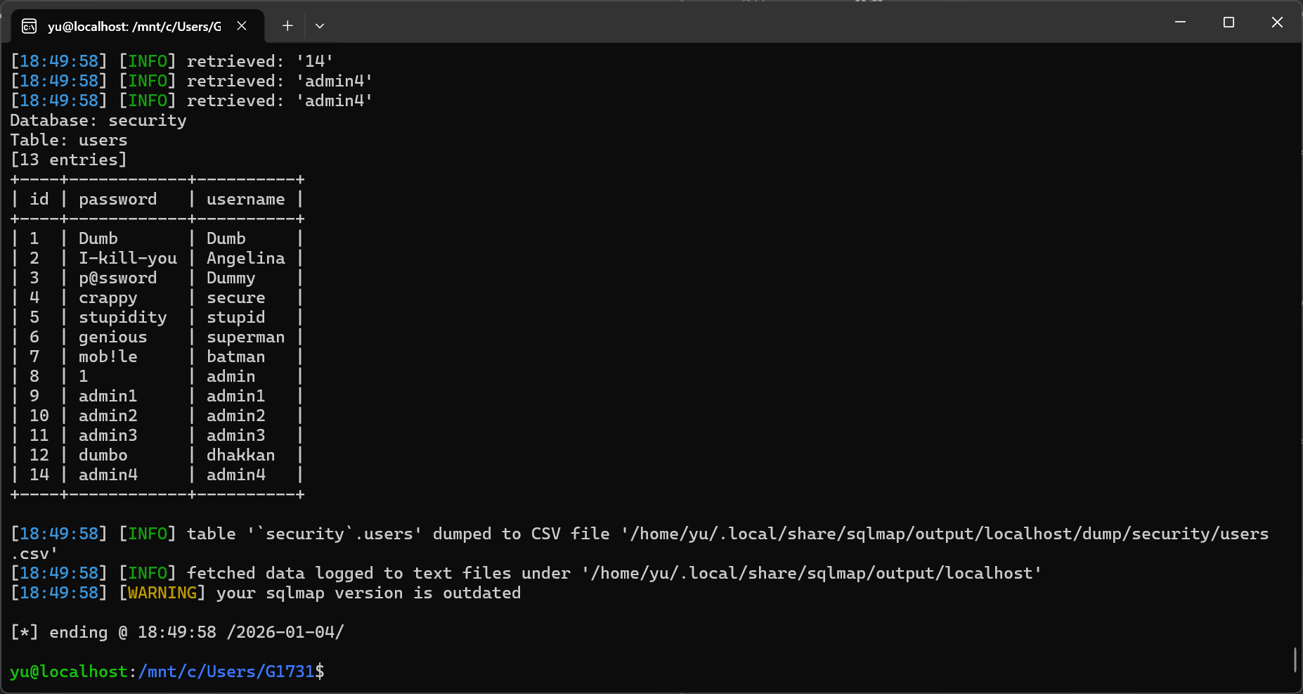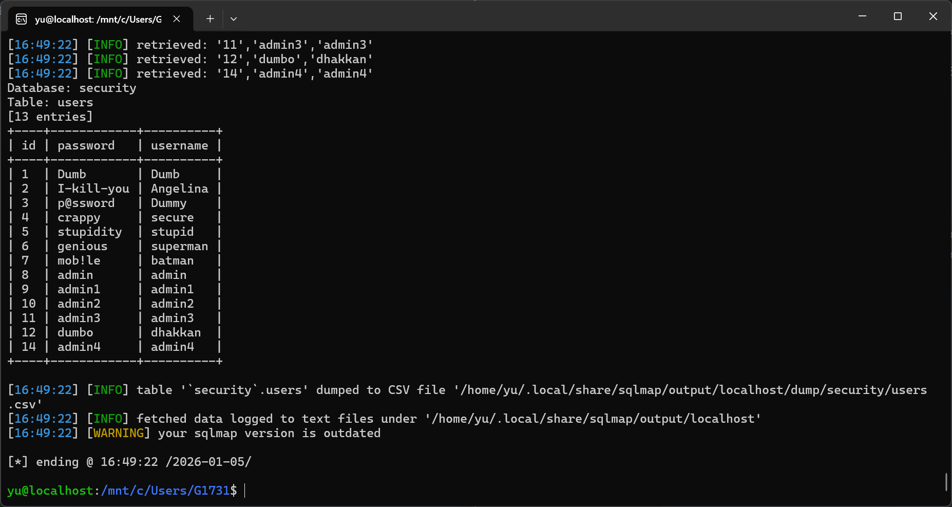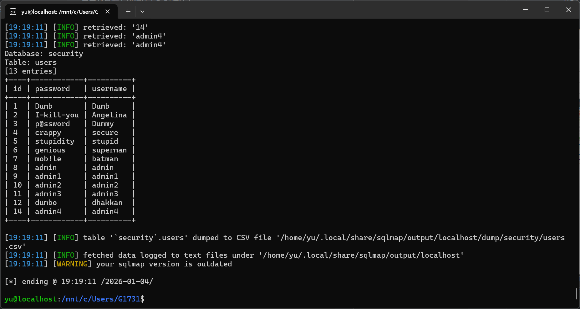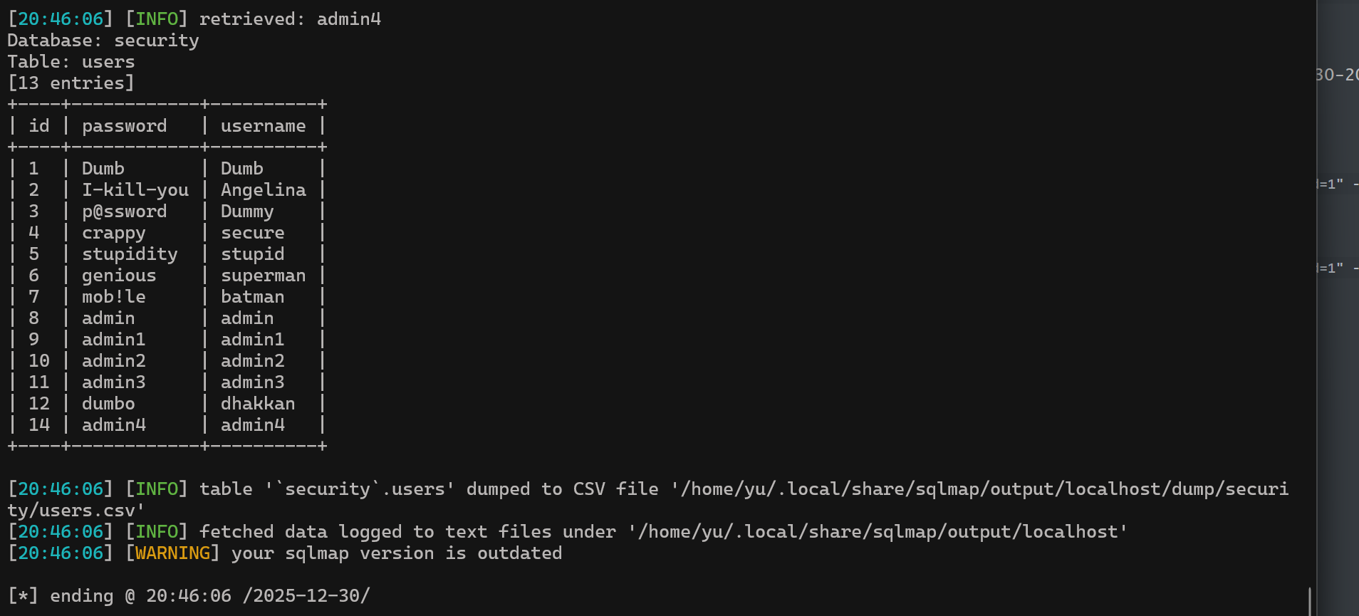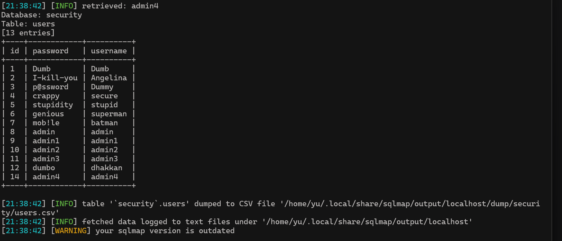 Database: securityTable: users[13 entries]+----+------------+----------+| id | password | username |+----+------------+----------+| 1 | Dumb | Dumb || 2 | I-kill-you | Angelina || 3 | p@ssword | Dummy || 4 | crappy | secure || 5 | stupidity | stupid || 6 | genious | superman || 7 | mob!le | batman || 8 | admin | admin || 9 | admin1 | admin1 || 10 | admin2 | admin2 || 11 | admin3 | admin3 || 12 | dumbo | dhakkan || 14 | admin4 | admin4 |+----+------------+----------+#17: