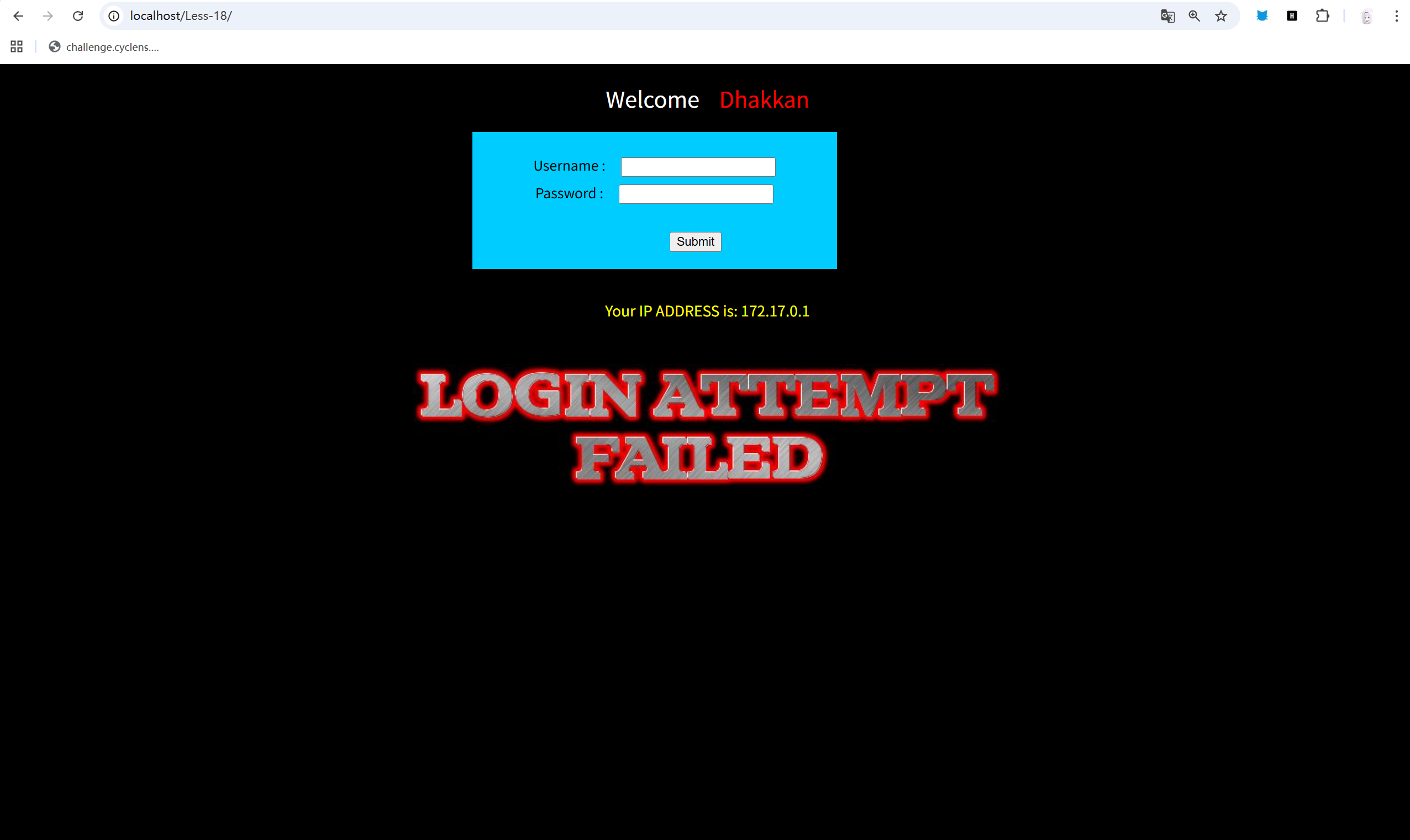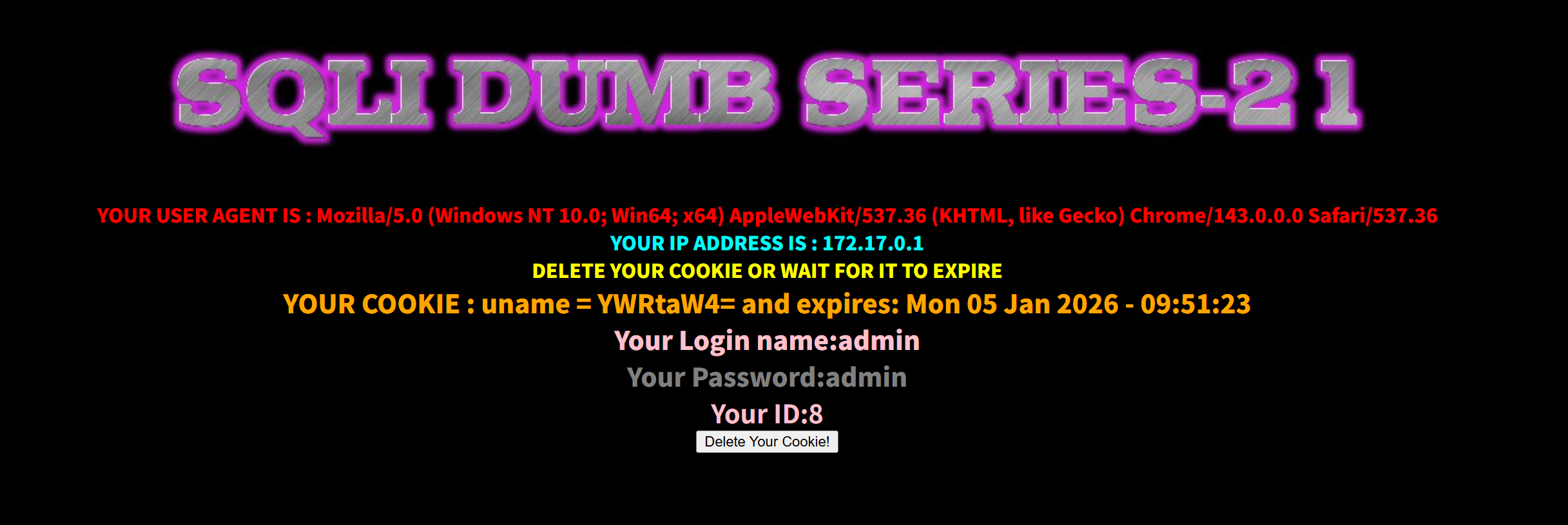 $sql="SELECT * FROM users WHERE username=$cookee1 LIMIT 0,1";这边的cookie被双引号包裹,而上一题的是单引号,小区别。