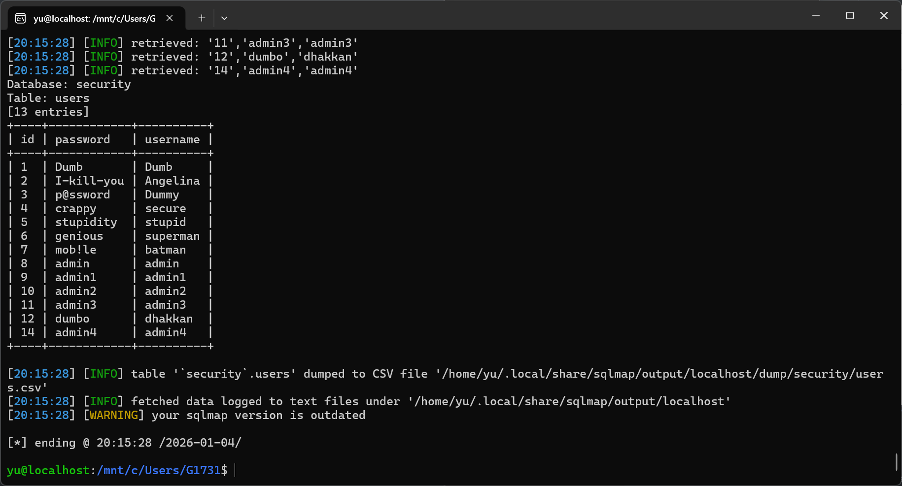 Database: securityTable: users[13 entries]+----+------------+----------+| id | password | username |+----+------------+----------+| 1 | Dumb | Dumb || 2 | I-kill-you | Angelina || 3 | p@ssword | Dummy || 4 | crappy | secure || 5 | stupidity | stupid || 6 | genious | superman || 7 | mob!le | batman || 8 | admin | admin || 9 | admin1 | admin1 || 10 | admin2 | admin2 || 11 | admin3 | admin3 || 12 | dumbo | dhakkan || 14 | admin4 | admin4 |+----+------------+----------+#15: